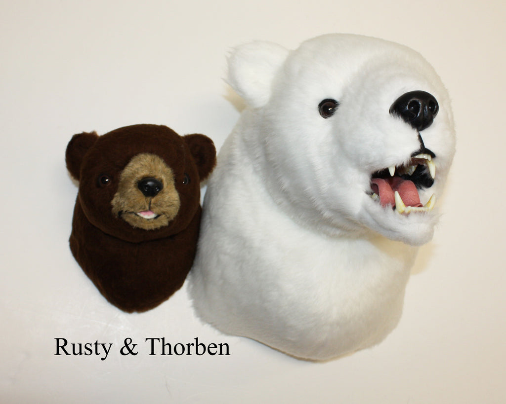 Thorben-Thor's bear-an animal of awesome respect to the Viking explorers. His head is sleek, almost streamlined. His mouth is wide open showing all of his teeth. His thick plush coat is super soft. Hang him high, give him lots of space, and he will look great.
